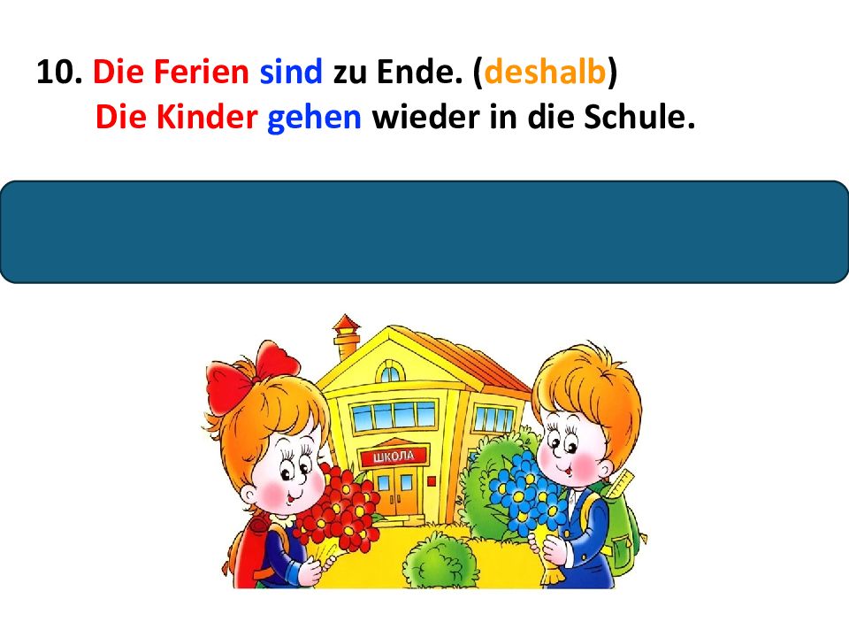 10. Die Ferien sind zu Ende. ( deshalb ) Die Kinder gehen wieder in die Schule. Die Ferien sind zu Ende, deshalb gehen die Kinder wieder in die Schule.