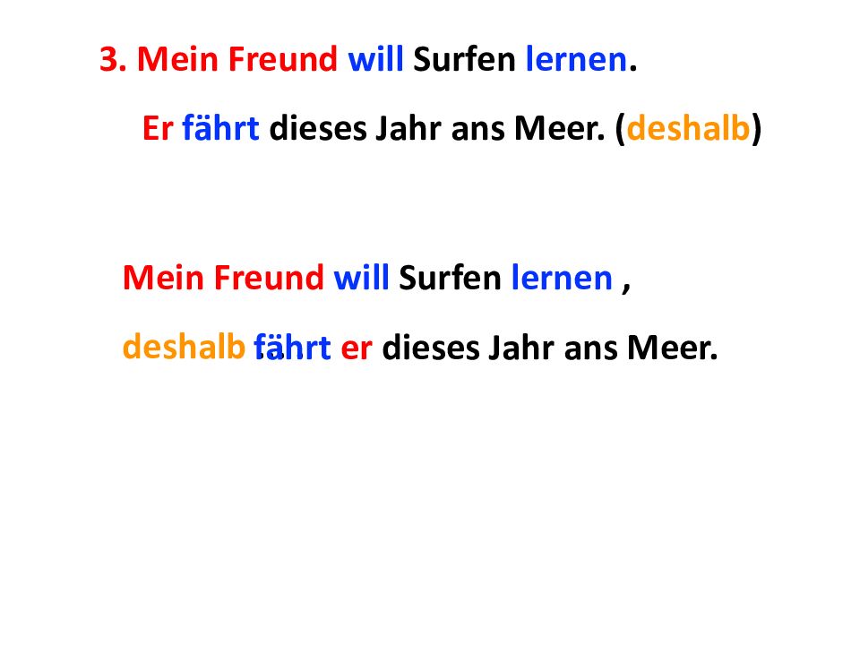 3. Mein Freund will Surfen lernen. Er fährt dieses Jahr ans Meer. ( deshalb ) Mein Freund will Surfen lernen, deshalb.... fährt er dieses Jahr ans Meer.