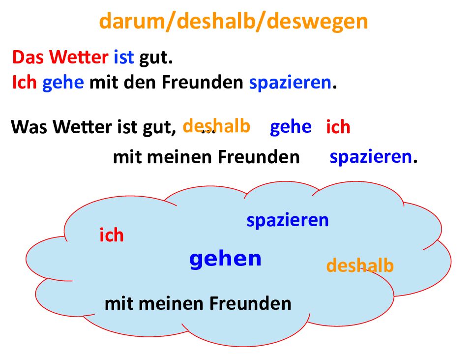 Was Wetter ist gut,... darum/deshalb/deswegen mit meinen Freunden ich gehen gehe ich mit meinen Freunden deshalb spazieren. spazieren deshalb Das Wetter ist gut. Ich gehe mit den Freunden spazieren.