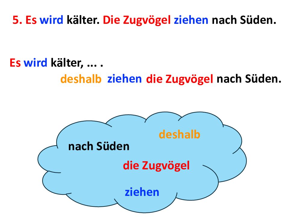5. Es wird kälter. Die Zugvögel ziehen nach Süden. Es wird kälter,.... deshalb ziehen die Zugvögel nach Süden deshalb ziehen die Zugvögel nach Süden.