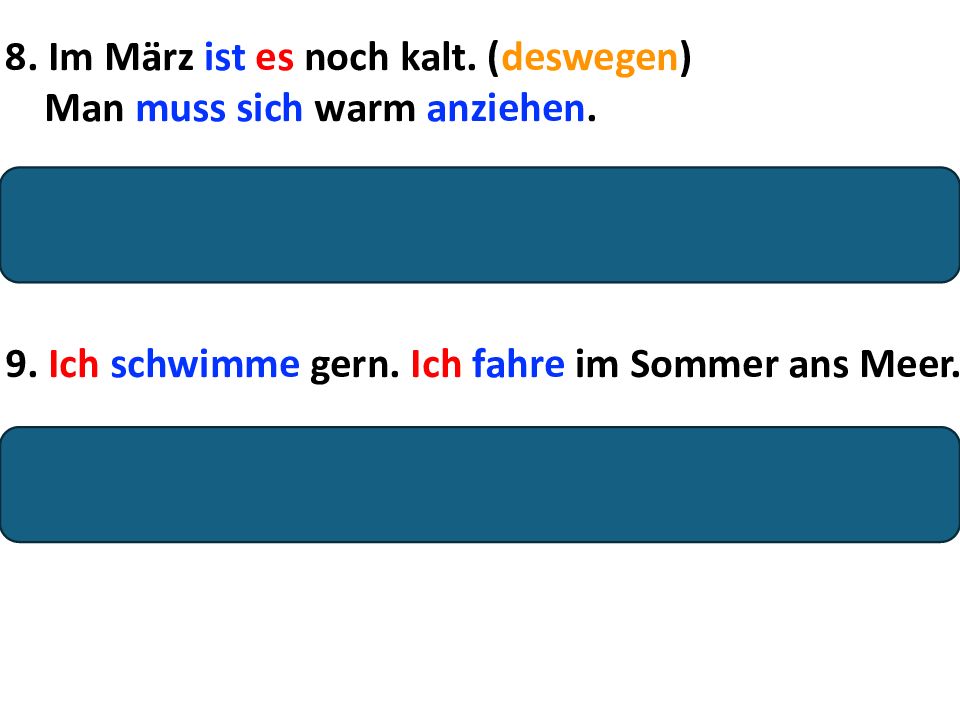8. Im März ist es noch kalt. ( deswegen ) Man muss sich warm anziehen. Im März ist es noch kalt, deswegen muss man sich warm anziehen. 9. Ich schwimme gern. Ich fahre im Sommer ans Meer. Ich schwimme gern, darum schwimme ich im Sommer ans Meer.