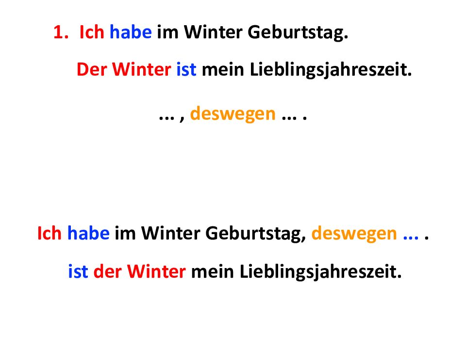 Ich habe im Winter Geburtstag. Der Winter ist mein Lieblingsjahreszeit. ..., deswegen.... Ich habe im Winter Geburtstag, deswegen.... ist der Winter mein Lieblingsjahreszeit.