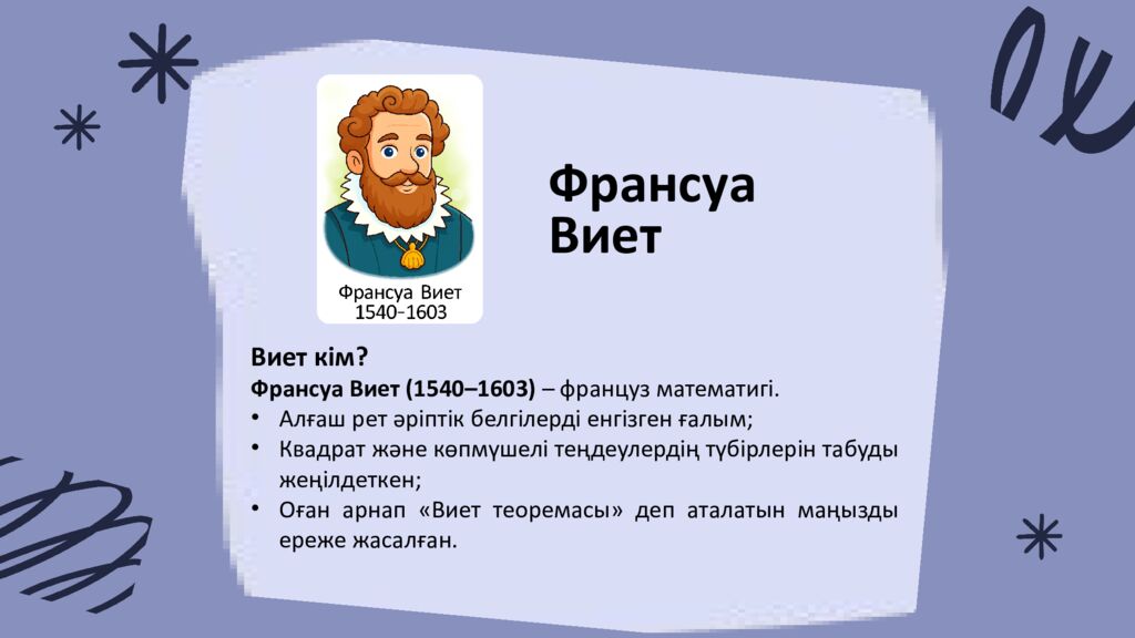 Франсуа Виет Виет кім ? Франсуа Виет (1540–1603) – француз математигі. Алғаш рет әріптік белгілерді енгізген ғалым ; Квадрат және көпмүшелі теңдеулердің түбірлерін табуды жеңілдеткен ; Оған арнап «Виет теоремасы » деп аталатын маңызды ереже жасалған.