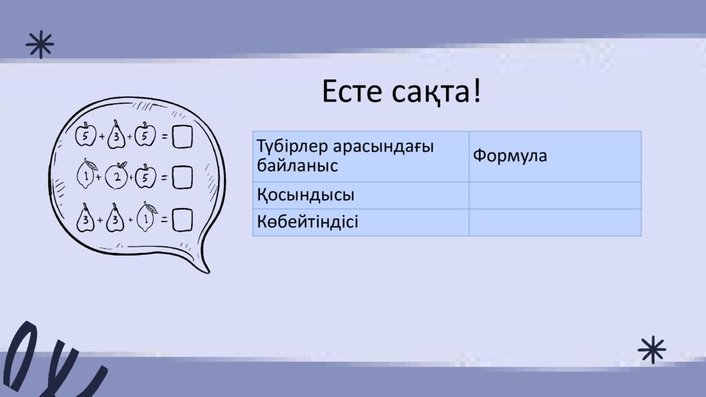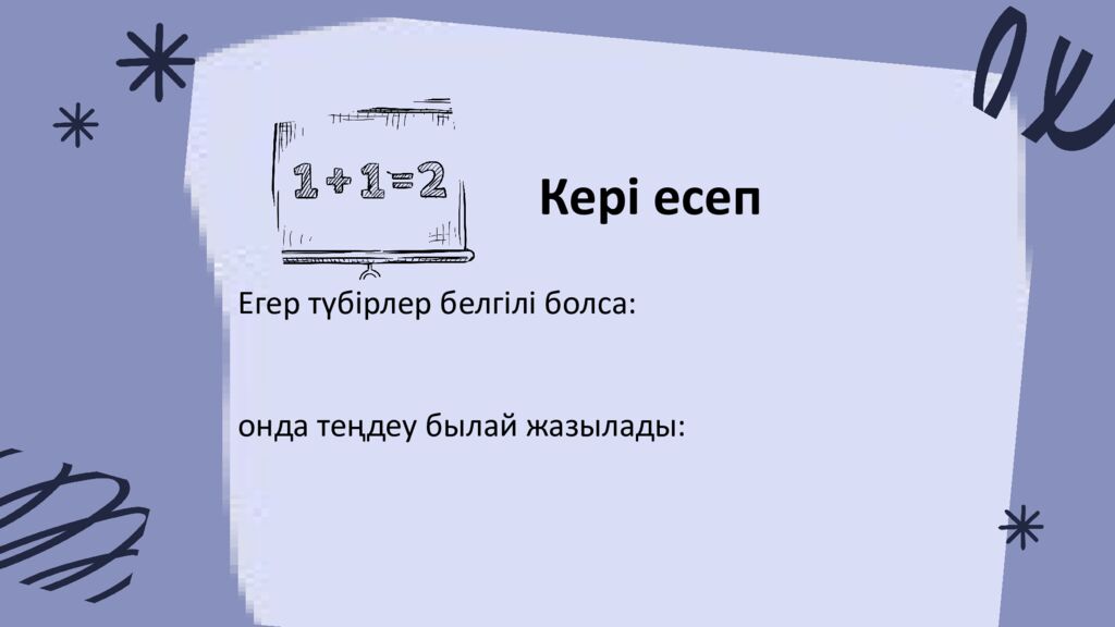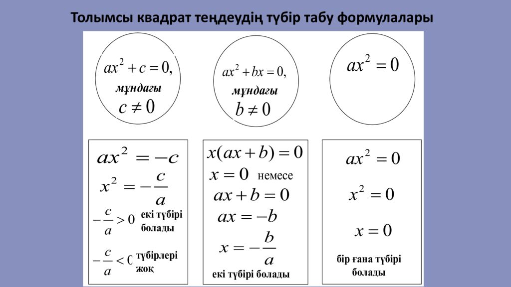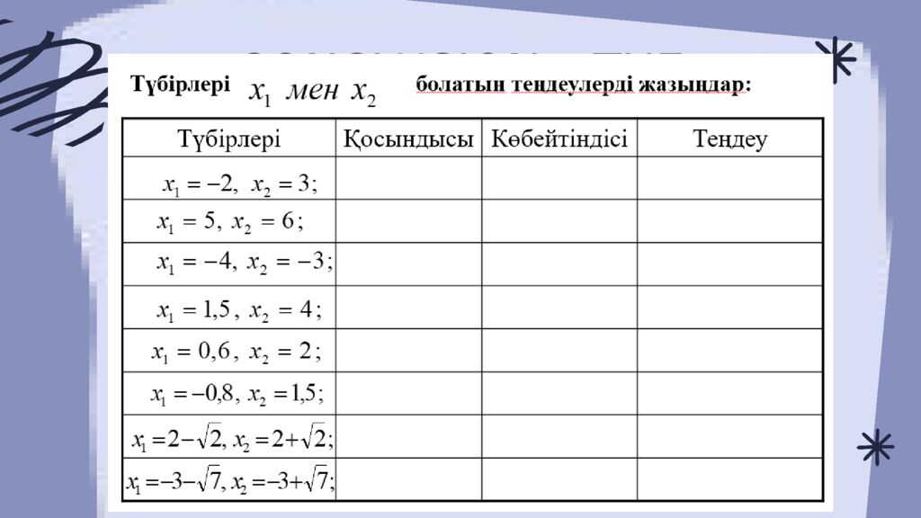 Есте сақта ! Түбірлер арасындағы байланыс Формула Қосындысы Көбейтіндісі Түбірлер арасындағы байланыс Формула Қосындысы Көбейтіндісі