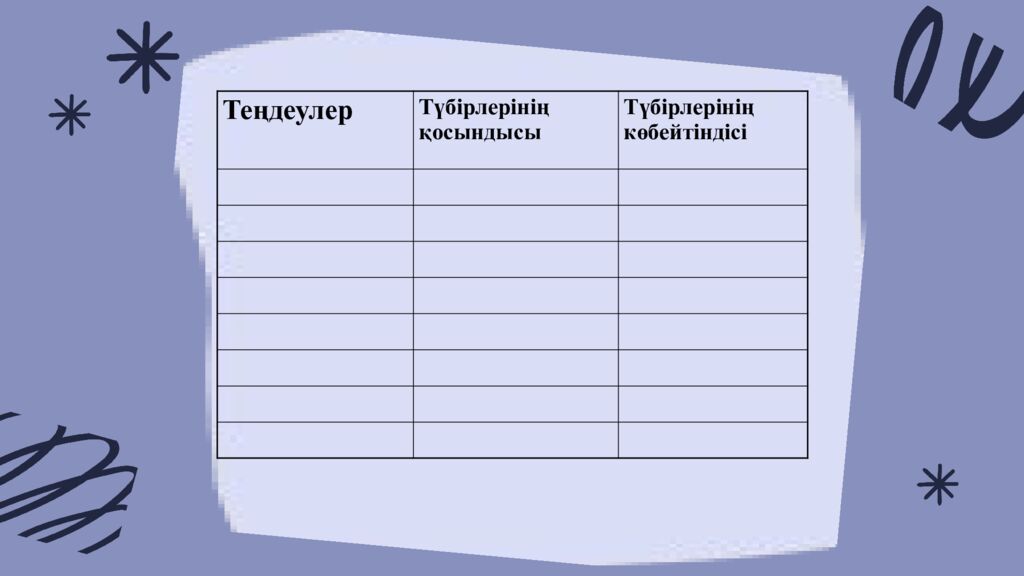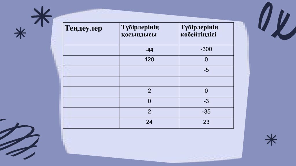 Теңдеулер Түбірлерінің қосындысы Түбірлерінің көбейтіндісі -44 -300 120 0 -5 2 0 0 -3 2 -35 24 23 Теңдеулер -44 -300 120 0 -5 2 0 0 -3 2 -35 24 23