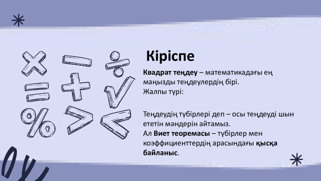 Кіріспе Квадрат теңдеу – математикадағы ең маңызды теңдеулердің бірі. Жалпы түрі : Теңдеудің түбірлері деп – осы теңдеуді шын ететін мәндерін айтамыз. Ал Виет теоремасы – түбірлер мен коэффициенттердің арасындағы қысқа байланыс.