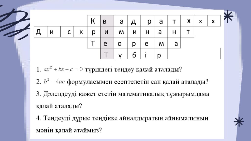 GEOMETRIC SHAPES AND SOLIDS Д и с к р и м и н а н т К в а д р а т Т е о р е м а Т ү б і р Х х х