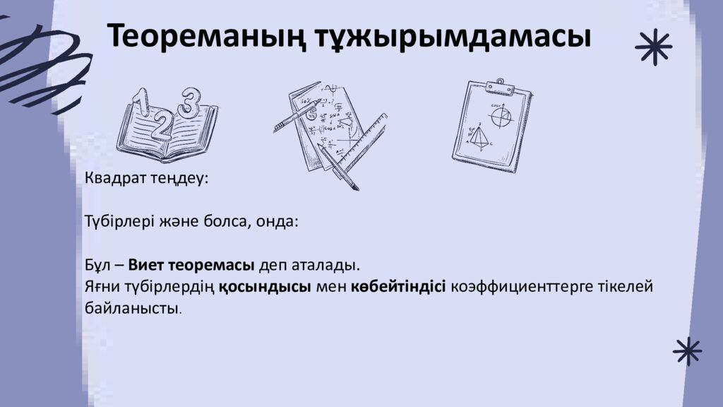 Квадрат теңдеу : Түбірлері және болса, онда : Бұл – Виет теоремасы деп аталады. Яғни түбірлердің қосындысы мен көбейтіндісі коэффициенттерге тікелей байланысты. Теореманың тұжырымдамасы