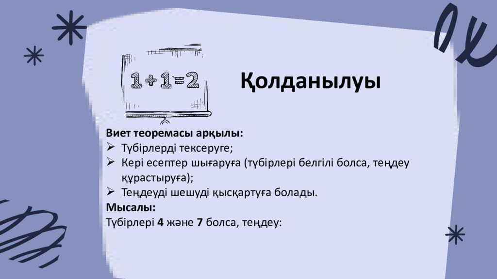 Қолданылуы Виет теоремасы арқылы : Түбірлерді тексеруге ; Кері есептер шығаруға ( түбірлері белгілі болса, теңдеу құрастыруға ); Теңдеуді шешуді қысқартуға болады. Мысалы : Түбірлері 4 және 7 болса, теңдеу :