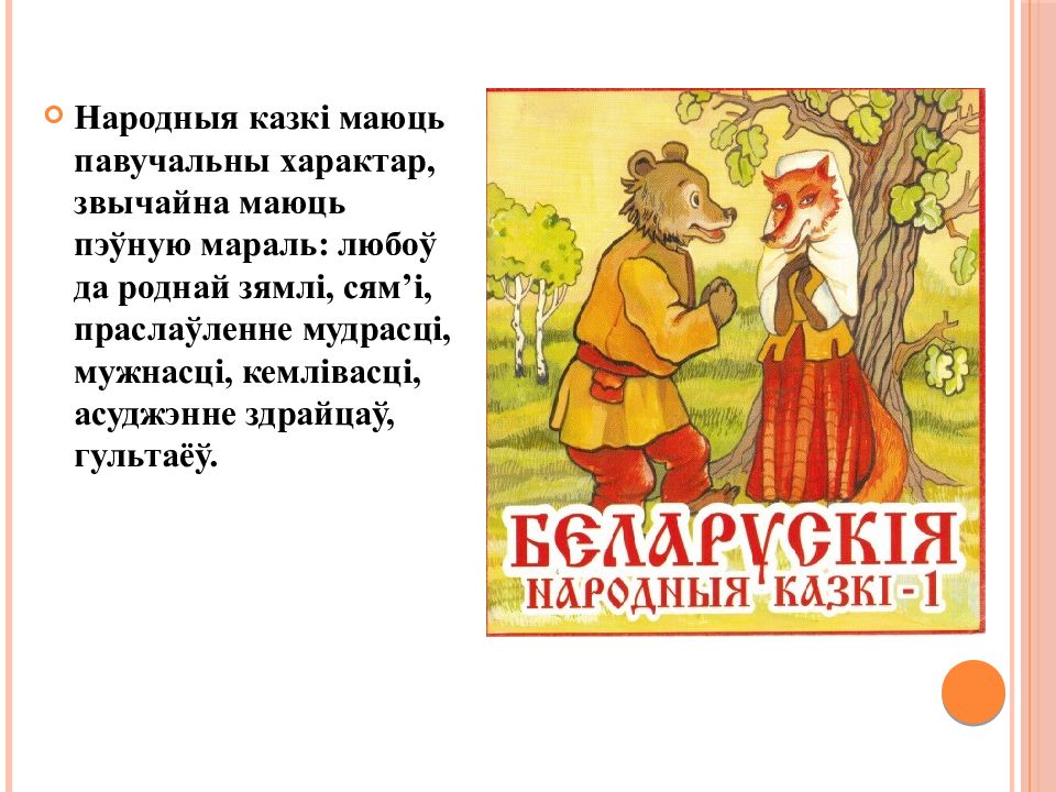 Народныя казкі маюць павучальны характар, звычайна маюць пэўную мараль : любоў да роднай зямлі, сям’і, праслаўленне мудрасці, мужнасці, кемлівасці, асуджэнне здрайцаў, гультаёў.