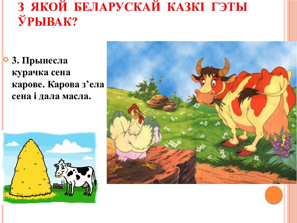 3. Прынесла курачка сена карове. Карова з’ела сена і дала масла.