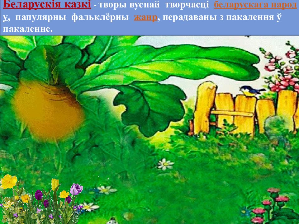 Беларускія казкі - творы вуснай творчасці беларускага народ у, папулярны фальклёрны жанр, перадаваны з пакалення ў пакаленне. -