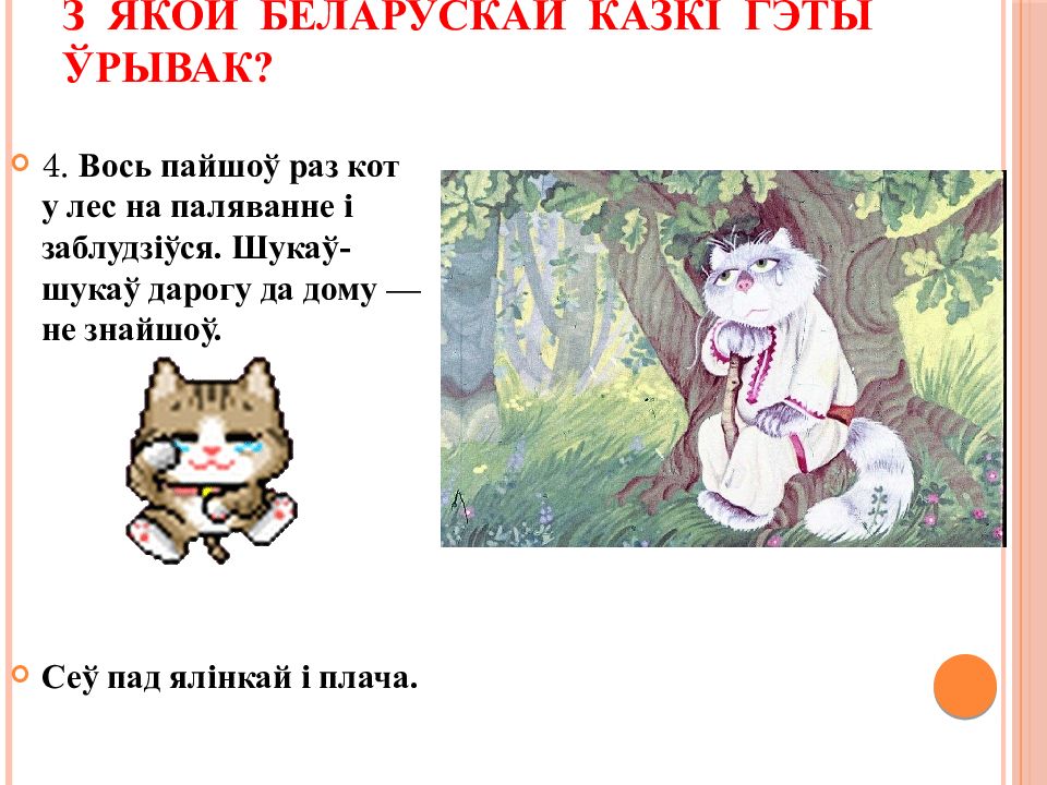 4. Вось пайшоў раз кот у лес на паляванне і заблудзіўся. Шукаў-шукаў дарогу да дому — не знайшоў. Сеў пад ялінкай і плача.