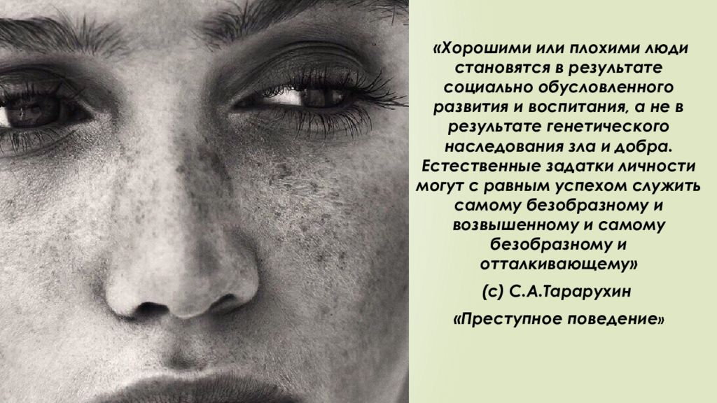 «Хорошими или плохими люди становятся в результате социально обусловленного развития и воспитания, а не в результате генетического наследования зла и добра. Естественные задатки личности могут с равным успехом служить самому безобразному и возвышенному и самому безобразному и отталкивающему» (с) С.А.Тарарухин «Преступное поведение »