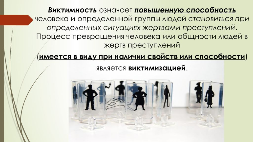 Виктимность означает повышенную способность человека и определенной группы людей становиться при определенных ситуациях жертвами преступлений. Процесс превращения человека или общности людей в жертв преступлений ( имеется в виду при наличии свойств или способности ) является виктимизацией.