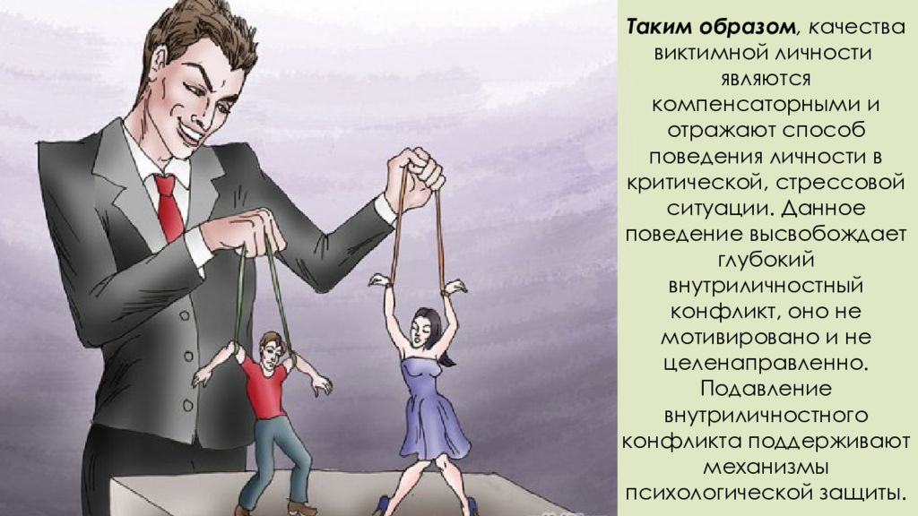 Таким образом, к ачества виктимной личности являются компенсаторными и отражают способ поведения личности в критической, стрессовой ситуации. Данное поведение высвобождает глубокий внутриличностный конфликт, оно не мотивировано и не целенаправленно. Подавление внутриличностного конфликта поддерживают механизмы психологической защиты.