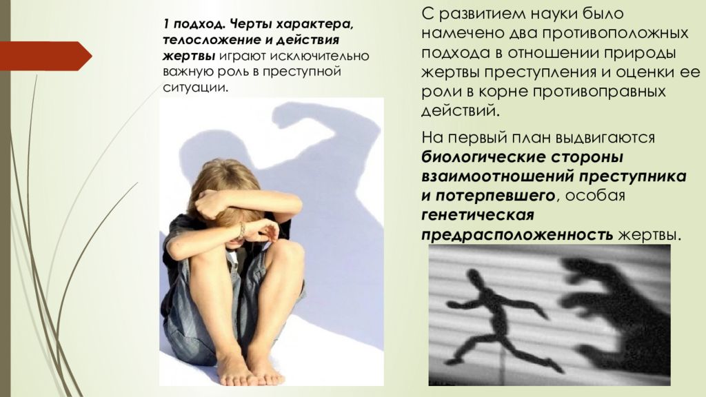 С развитием науки было намечено два противоположных подхода в отношении природы жертвы преступления и оценки ее роли в корне противоправных действий. На первый план выдвигаются биологические стороны взаимоотношений преступника и потерпевшего, особая генетическая предрасположенность жертвы. 1 подход. Черты характера, телосложение и действия жертвы играют исключительно важную роль в преступной ситуации.