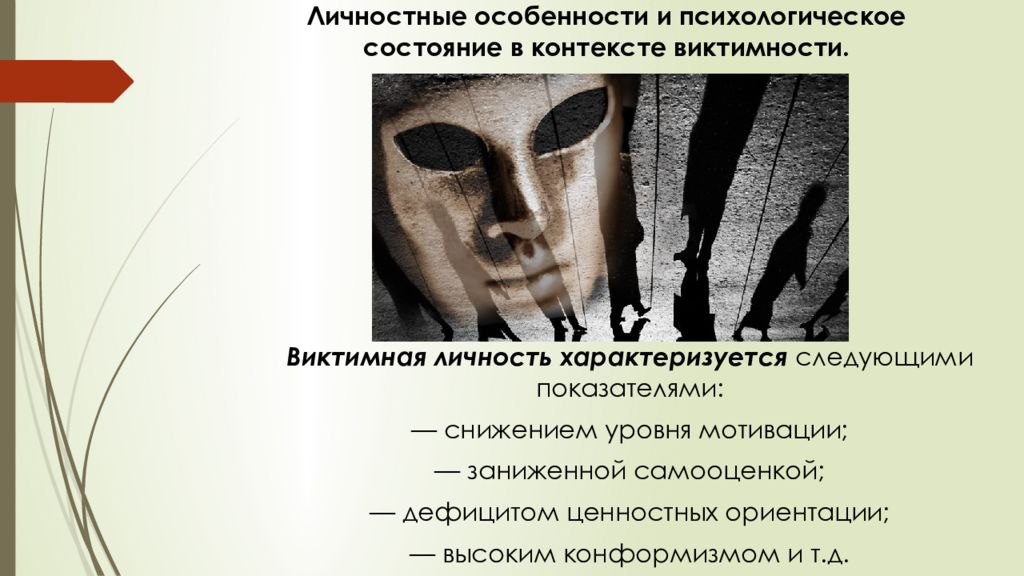 Виктимная личность характеризуется следующими показателями: — снижением уровня мотивации; — заниженной самооценкой; — дефицитом ценностных ориентации; — высоким конформизмом и т.д.