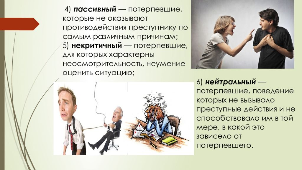 6 ) нейтральный — потерпевшие, поведение которых не вызывало преступные действия и не способствовало им в той мере, в какой это зависело от потерпевшего. 4) пассивный — потерпевшие, которые не оказывают противодействия преступнику по самым различным причинам; 5 ) некритичный — потерпевшие, для которых характерны неосмотрительность, неумение оценить ситуацию;