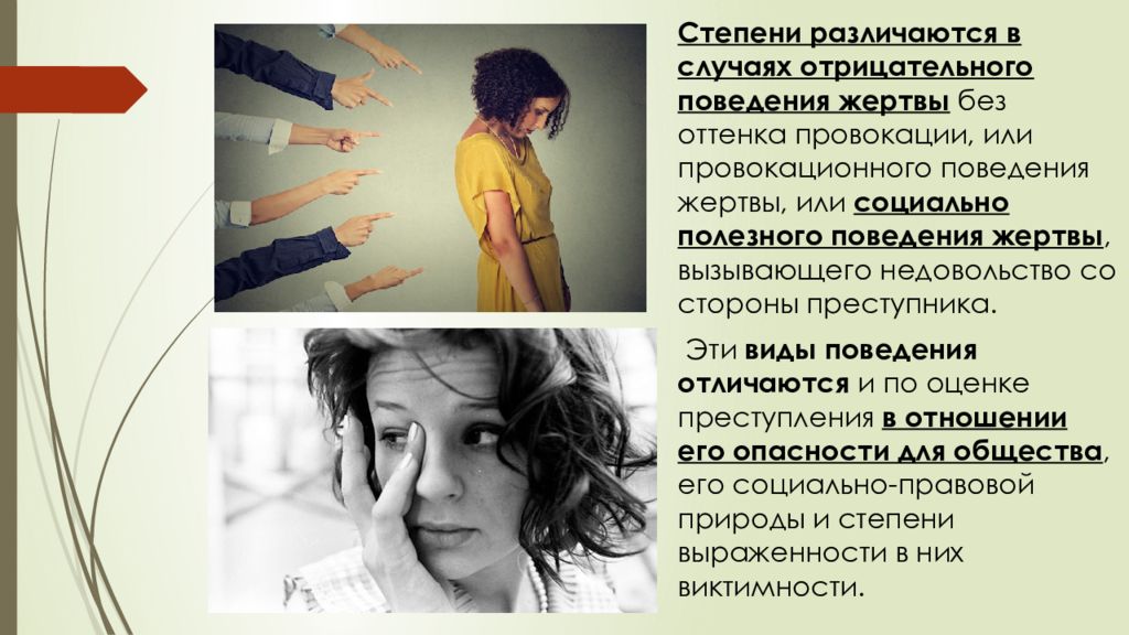 Степени различаются в случаях отрицательного поведения жертвы без оттенка провокации, или провокационного поведения жертвы, или социально полезного поведения жертвы, вызывающего недовольство со стороны преступника. Эти виды поведения отличаются и по оценке преступления в отношении его опасности для общества, его социально-правовой природы и степени выраженности в них виктимности.