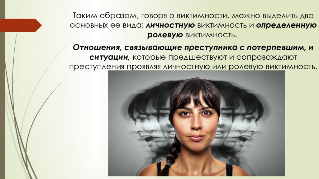 Таким образом, говоря о виктимности, можно выделить два основных ее вида: личностную виктимность и определенную ролевую виктимность. Отношения, связывающие преступника с потерпевшим, и ситуации, которые предшествуют и сопровождают преступления проявляя личностную или ролевую виктимность.