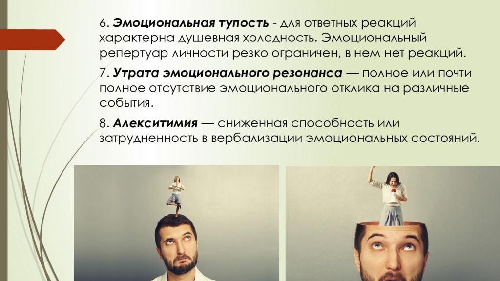 6. Эмоциональная тупость - для ответных реакций характерна душевная холодность. Эмоциональный репертуар личности резко ограничен, в нем нет реакций. 7. Утрата эмоционального резонанса — полное или почти полное отсутствие эмоционального отклика на различные события. 8. Алекситимия — сниженная способность или затрудненность в вербализации эмоциональных состояний.