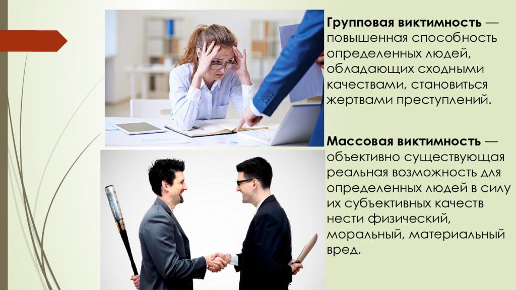 Групповая виктимность — повышенная способность определенных людей, обладающих сходными качествами, становиться жертвами преступлений. Массовая виктимность — объективно существующая реальная возможность для определенных людей в силу их субъективных качеств нести физический, моральный, материальный вред.