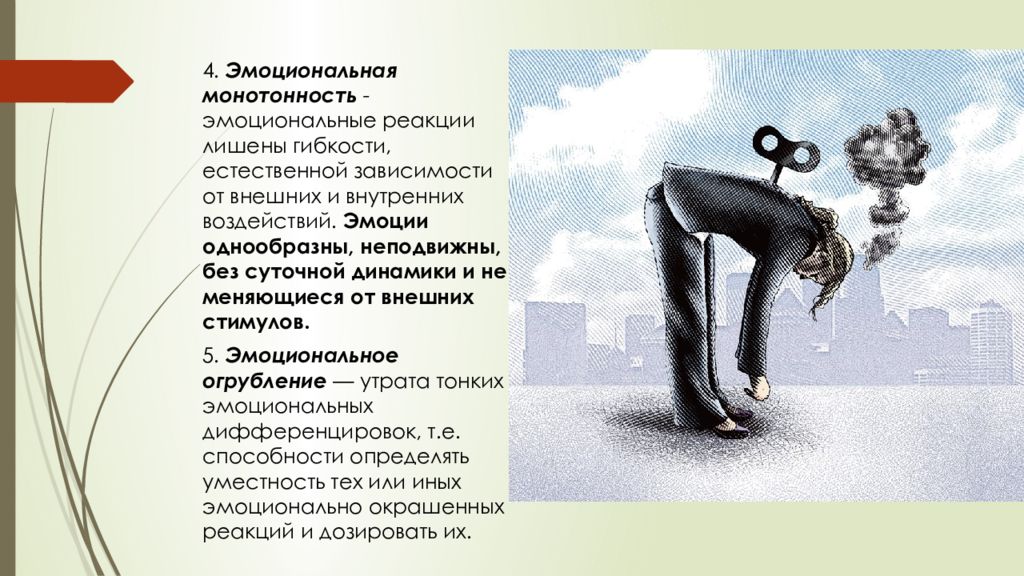 4. Эмоциональная монотонность - э моциональные реакции лишены гибкости, естественной зависимости от внешних и внутренних воздействий. Эмоции однообразны, неподвижны, без суточной динамики и не меняющиеся от внешних стимулов. 5. Эмоциональное огрубление — утрата тонких эмоциональных дифференцировок, т.е. способности определять уместность тех или иных эмоционально окрашенных реакций и дозировать их.