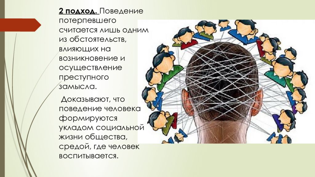 2 подход. Поведение потерпевшего считается лишь одним из обстоятельств, влияющих на возникновение и осуществление преступного замысла. Доказывают, что поведение человека формируются укладом социальной жизни общества, средой, где человек воспитывается.