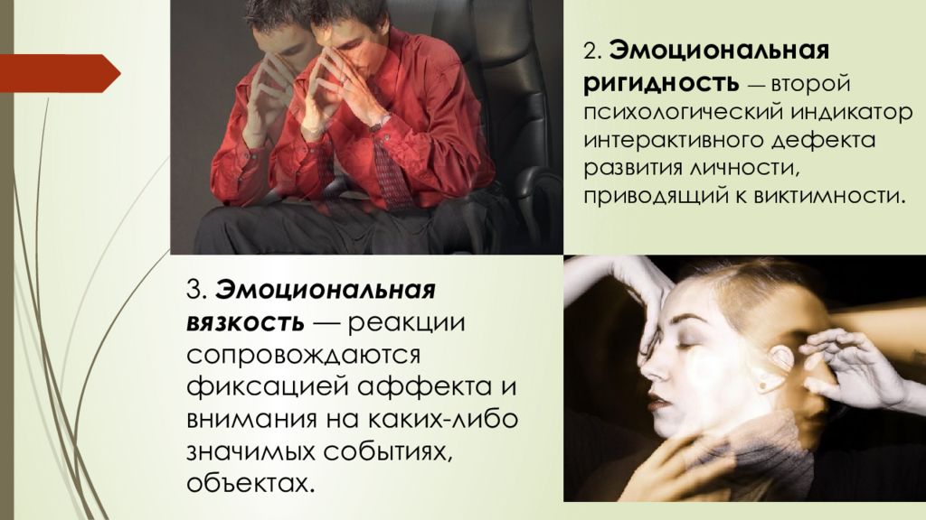 3. Эмоциональная вязкость — реакции сопровождаются фиксацией аффекта и внимания на каких-либо значимых событиях, объектах. 2. Эмоциональная ригидность — второй психологический индикатор интерактивного дефекта развития личности, приводящий к виктимности.