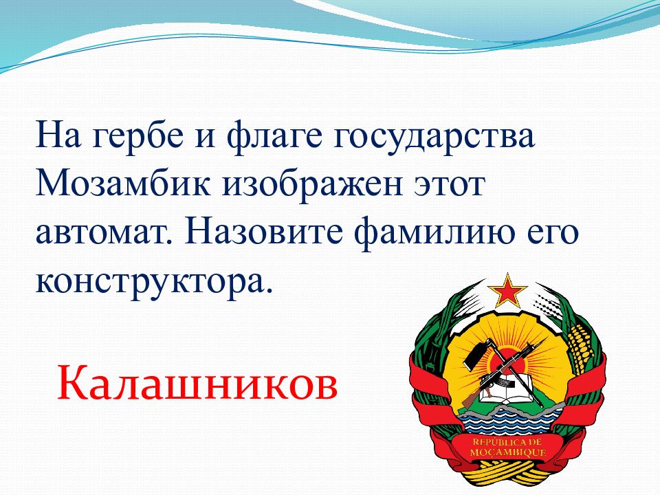 Калашников На гербе и флаге государства Мозамбик изображен этот автомат. Назовите фамилию его конструктора.