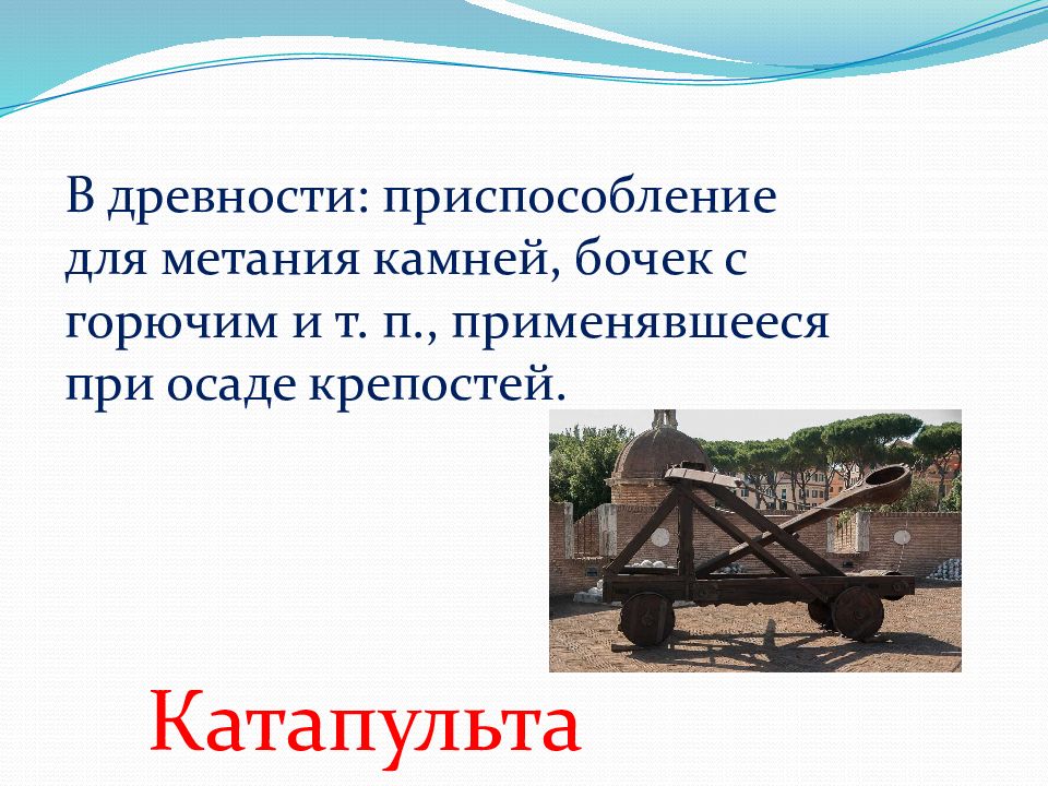 Катапульта В древности: приспособление для метания камней, бочек с горючим и т. п., применявшееся при осаде крепостей.