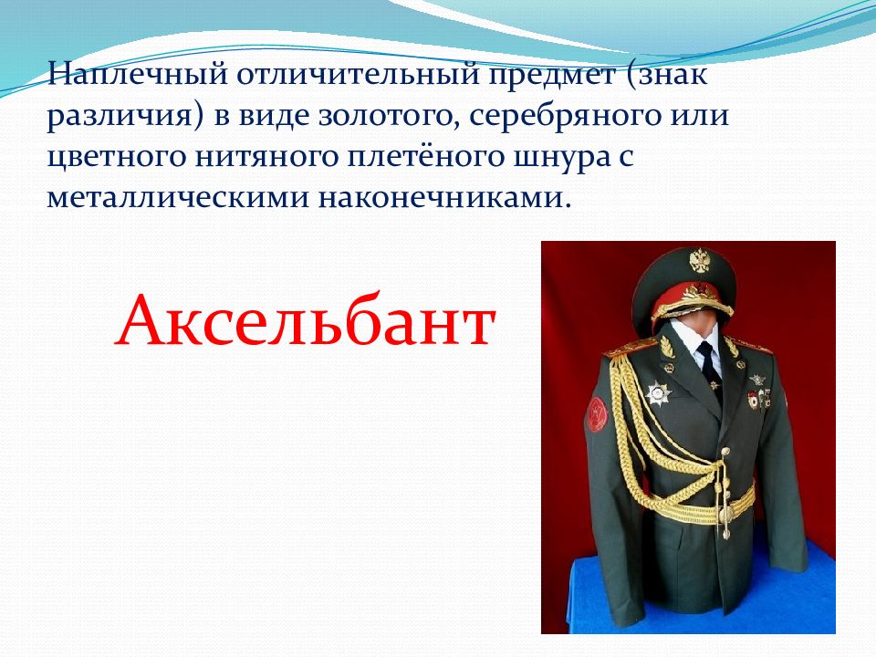 Наплечный отличительный предмет (знак различия) в виде золотого, серебряного или цветного нитяного плетёного шнура с металлическими наконечниками. Аксельбант