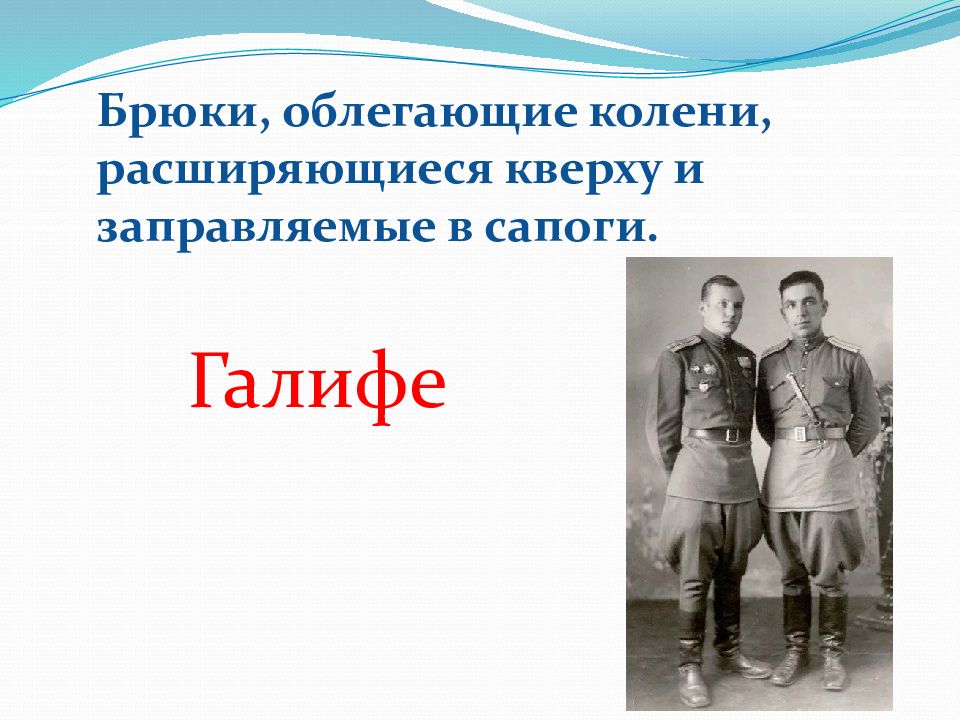 Брюки, облегающие колени, расширяющиеся кверху и заправляемые в сапоги. Галифе