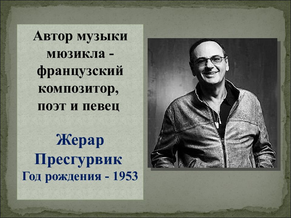Автор музыки мюзикла - французский композитор, поэт и певец Жерар Пресгурвик Год рождения - 1953