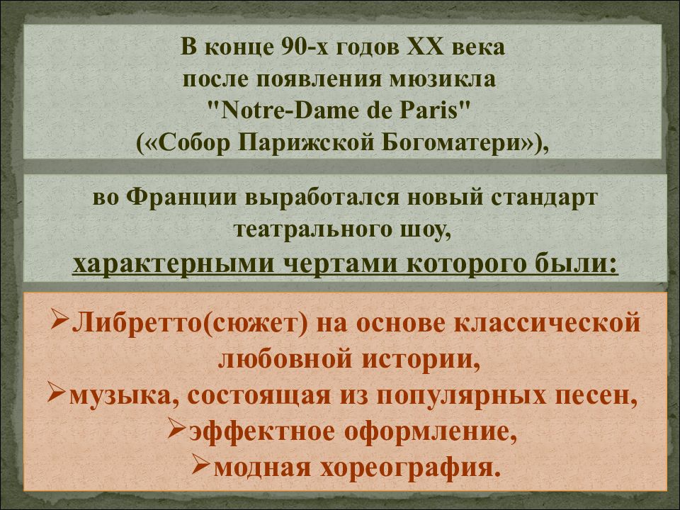 В конце 90-х годов XX века после появления мюзикла " Notre-Dame de Paris " («Собор Парижской Богоматери»), во Франции выработался новый стандарт театрального шоу, характерными чертами которого были: Либретто(сюжет) на основе классической любовной истории, музыка, состоящая из популярных песен, эффектное оформление, модная хореография.