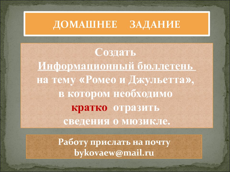 Создать Информационный бюллетень на тему « Ромео и Джульетта », в котором необходимо кратко отразить сведения о мюзикле. ДОМАШНЕЕ ЗАДАНИЕ Работу прислать на почту bykovaew@mail.ru