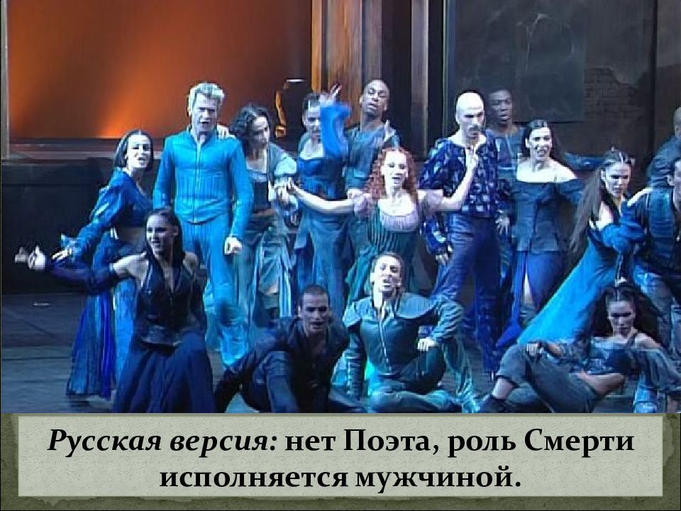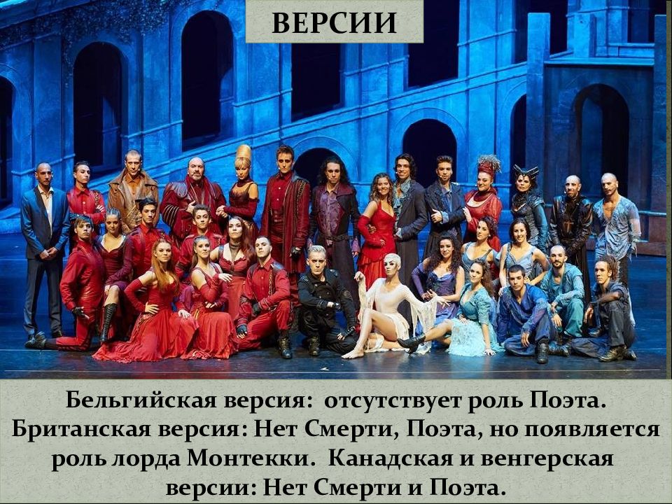 ВЕРСИИ Бельгийская версия: отсутствует роль Поэта. Британская версия: Нет Смерти, Поэта, но появляется роль лорда Монтекки. Канадская и венгерская версии: Нет Смерти и Поэта.