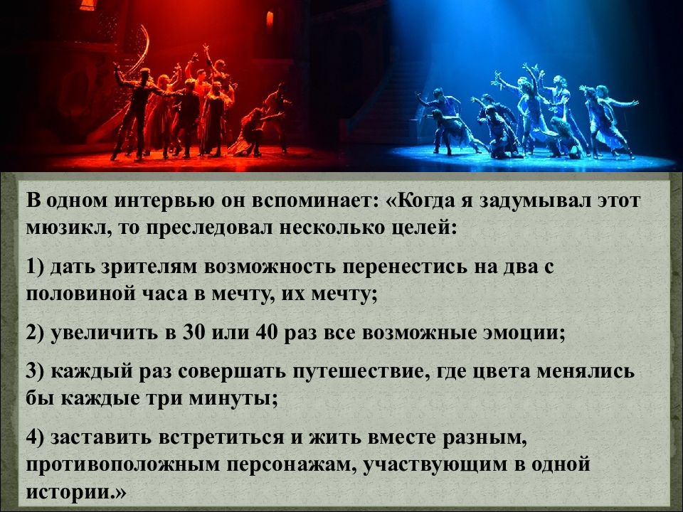 В одном интервью он вспоминает: «Когда я задумывал этот мюзикл, то преследовал несколько целей: 1) дать зрителям возможность перенестись на два с половиной часа в мечту, их мечту; 2) увеличить в 30 или 40 раз все возможные эмоции; 3) каждый раз совершать путешествие, где цвета менялись бы каждые три минуты; 4) заставить встретиться и жить вместе разным, противоположным персонажам, участвующим в одной истории.»