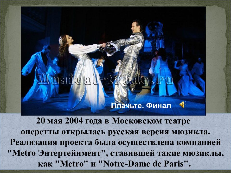 20 мая 2004 года в Московском театре оперетты открылась русская версия мюзикла. Реализация проекта была осуществлена компанией " Metro Энтертейнмент ", ставившей такие мюзиклы, как " Metro " и " Notre-Dame de Paris ". Плачьте. Финал