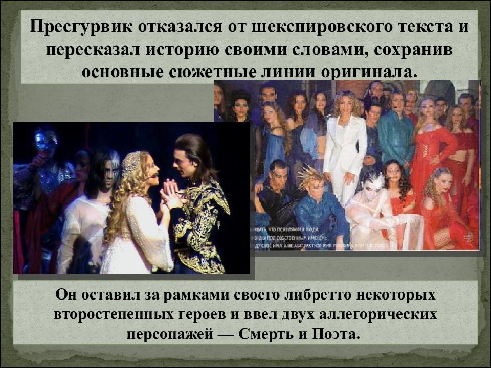 Пресгурвик отказался от шекспировского текста и пересказал историю своими словами, сохранив основные сюжетные линии оригинала. Он оставил за рамками своего либретто некоторых второстепенных героев и ввел двух аллегорических персонажей — Смерть и Поэта.