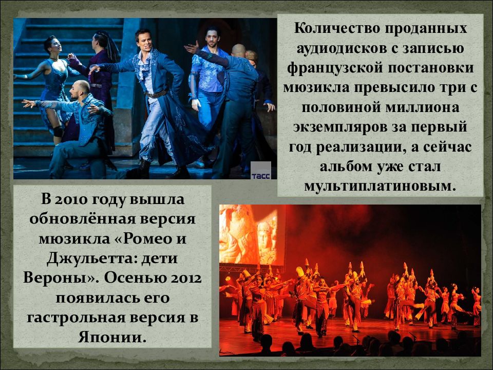 В 2010 году вышла обновлённая версия мюзикла «Ромео и Джульетта: дети Вероны». Осенью 2012 появилась его гастрольная версия в Японии. Количество проданных аудиодисков с записью французской постановки мюзикла превысило три с половиной миллиона экземпляров за первый год реализации, а сейчас альбом уже стал мультиплатиновым.