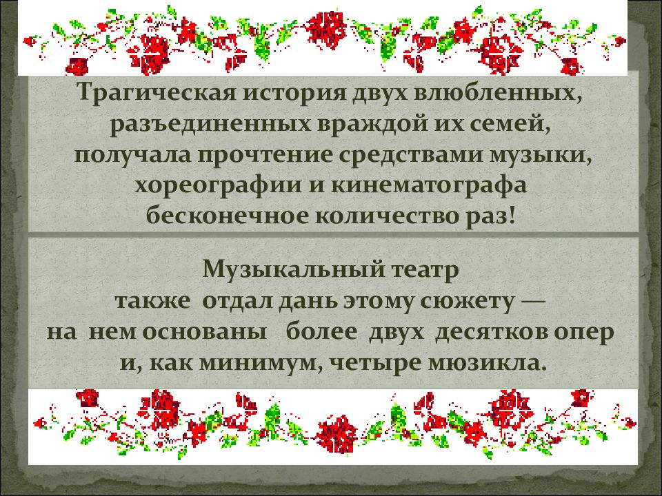 Трагическая история двух влюбленных, разъединенных враждой их семей, получала прочтение средствами музыки, хореографии и кинематографа бесконечное количество раз! Музыкальный театр также отдал дань этому сюжету — на нем основаны более двух десятков опер и, как минимум, четыре мюзикла.
