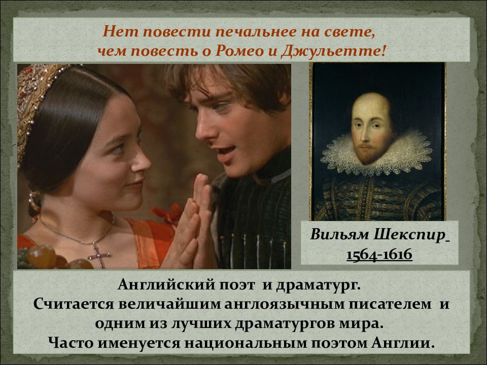 Вильям Шекспир 1564-1616 Английский поэт и драматург. Считается величайшим англоязычным писателем и одним из лучших драматургов мира. Часто именуется национальным поэтом Англии. Нет повести печальнее на свете, чем повесть о Ромео и Джульетте!