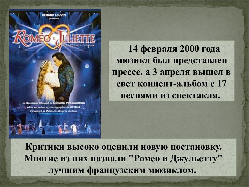 14 февраля 2000 года мюзикл был представлен прессе, а 3 апреля вышел в свет концепт-альбом с 17 песнями из спектакля. Критики высоко оценили новую постановку. Многие из них назвали "Ромео и Джульетту" лучшим французским мюзиклом.