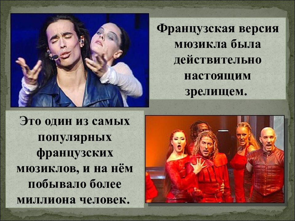 Это один из самых популярных французских мюзиклов, и на нём побывало более миллиона человек. Французская версия мюзикла была действительно настоящим зрелищем.