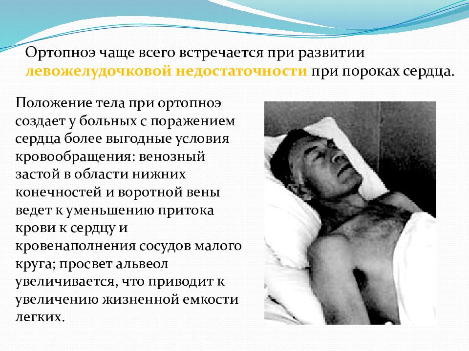 Положение тела при ортопноэ создает у больных с поражением сердца более выгодные условия кровообращения: венозный застой в области нижних конечностей и воротной вены ведет к уменьшению притока крови к сердцу и кровенаполнения сосудов малого круга; просвет альвеол увеличивается, что приводит к увеличению жизненной емкости легких. Ортопноэ чаще всего встречается при развитии левожелудочковой недостаточности при пороках сердца.