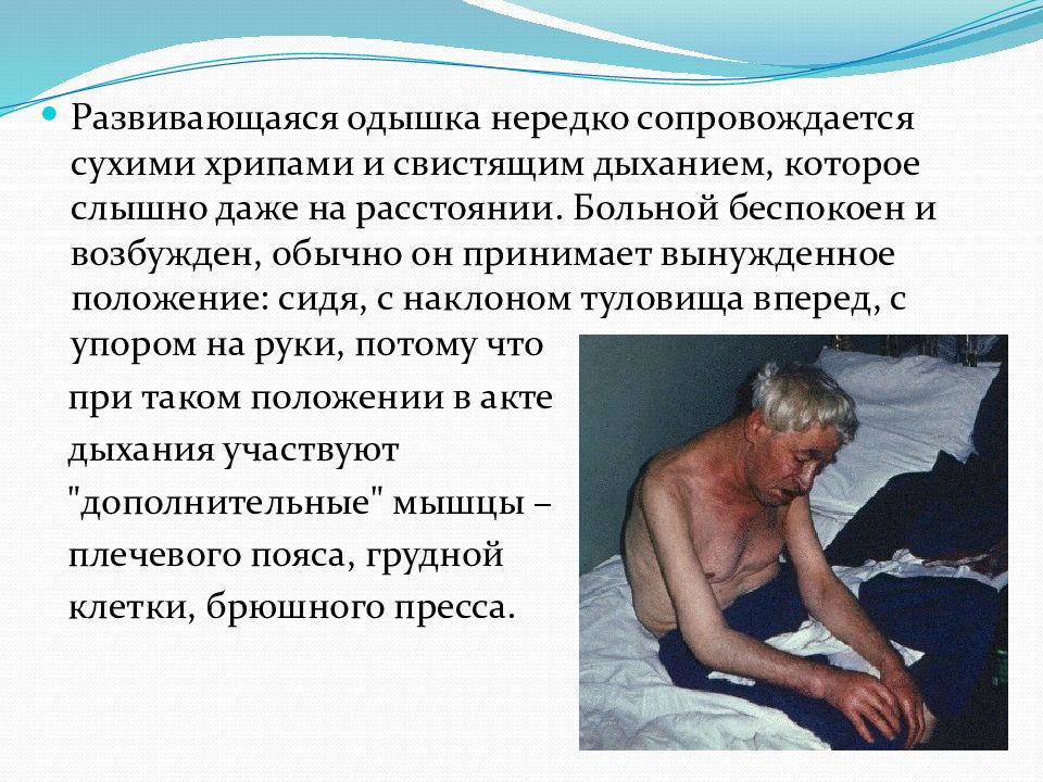 Развивающаяся одышка нередко сопровождается сухими хрипами и свистящим дыханием, которое слышно даже на расстоянии. Больной беспокоен и возбужден, обычно он принимает вынужденное положение: сидя, с наклоном туловища вперед, с упором на руки, потому что при таком положении в акте дыхания участвуют " дополнительные" мышцы – плечевого пояса, грудной клетки, брюшного пресса.