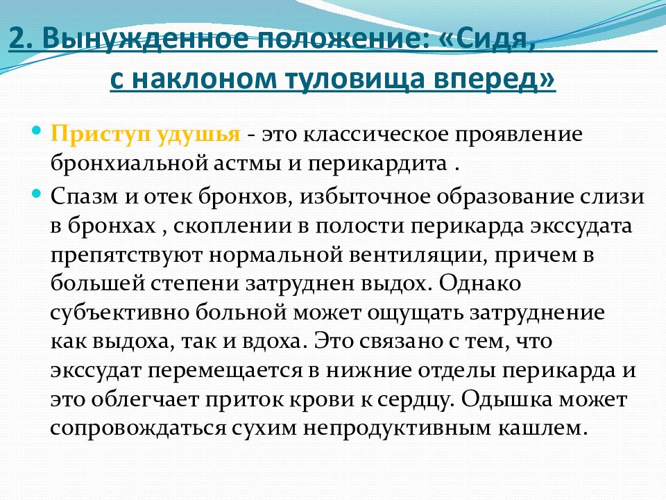 Слайд 3: 1. Вынужденное положение: «Ортопноэ »