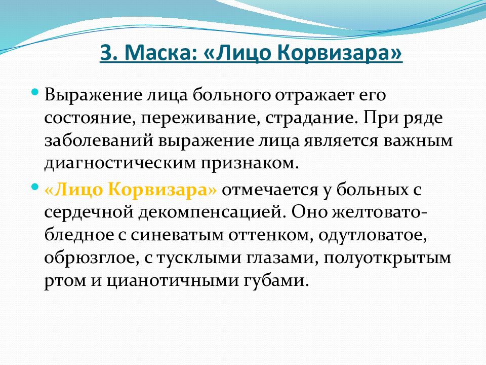 Выражение лица больного отражает его состояние, переживание, страдание. При ряде заболеваний выражение лица является важным диагностическим признаком. «Лицо Корвизара» отмечается у больных с сердечной декомпенсацией. Оно желтовато-бледное с синеватым оттенком, одутловатое, обрюзглое, с тусклыми глазами, полуоткрытым ртом и цианотичными губами.